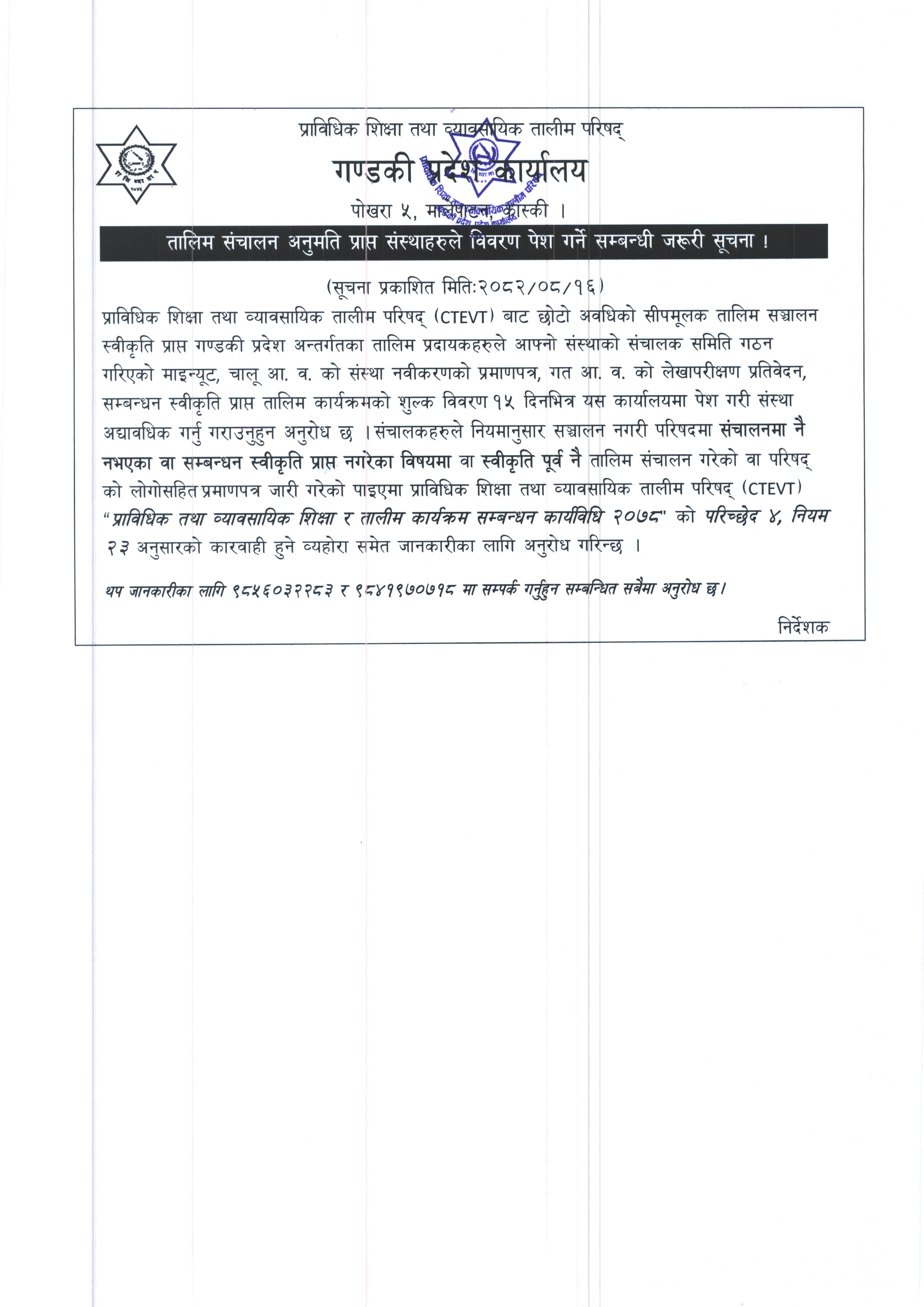तालिम संचालन अनुमति प्राप्त संस्थाहरुले विवरण पेश गर्ने सम्बन्धी जरुरी सूचना